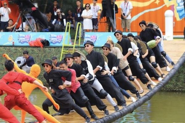 兩撥人站在搖擺橋上,由慢而快的來回擺動,平衡力差的將會落入水中,這一好玩的游樂項目一經開始,便火爆的不得了。