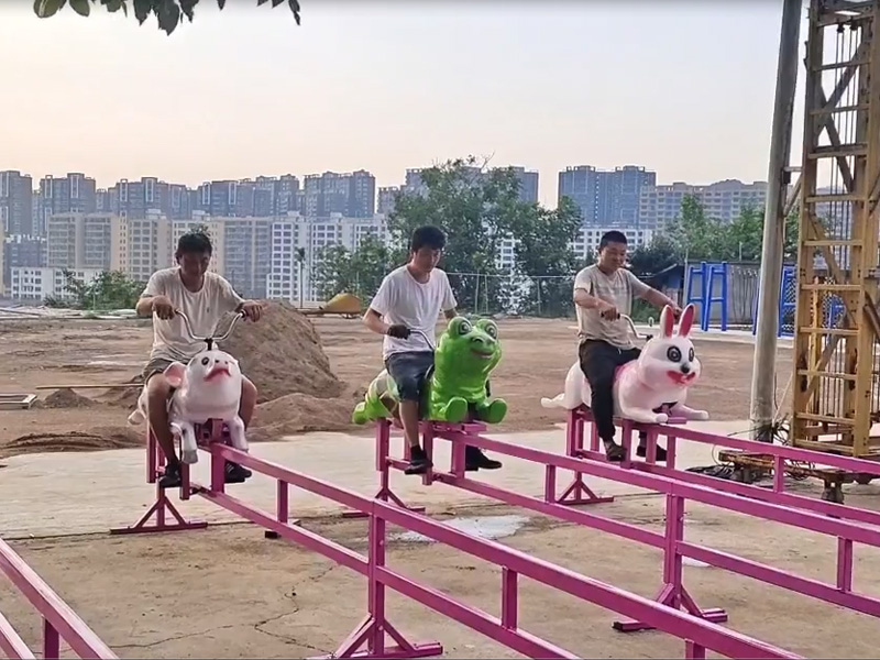 乘客騎坐在形態(tài)各異的小豬座艙上,用手中的搖桿帶動(dòng)輪子在軌道上前進(jìn)或后退,想要跑得快還是需要一定的技巧,朋友之間可以來一場歡樂的友誼賽,很是有趣。